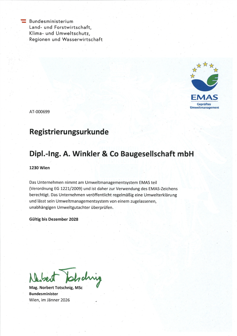 Wir sind das erste österreichische Bauunternehmen welches im Sektor Bau EMAS validiert ist. Hierbei handelt es sich um eine erweiterte Umwelterklärung welche beim Umweltbundesamt eingereicht und im EMAS-Register eingetragen ist.